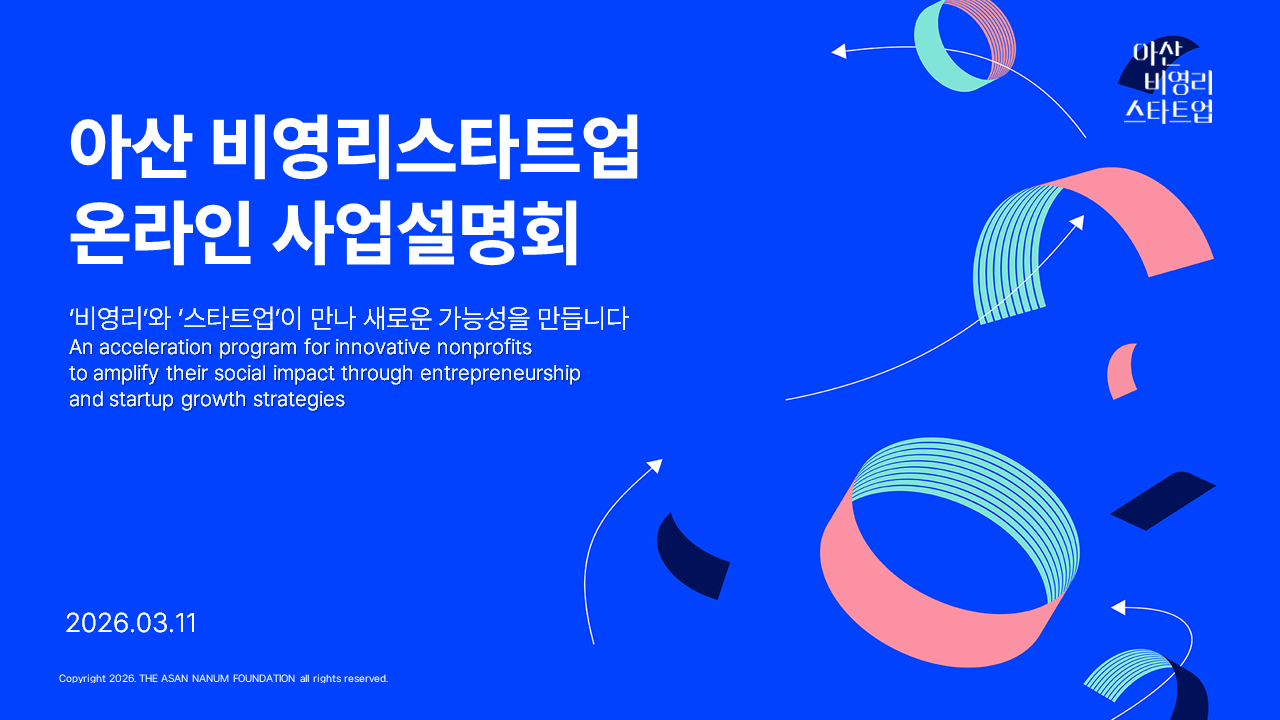 아산상회는 프로그램을 통해 개인의 특성 및 배경과 무관하게 기업가정신을 발휘할 수 있도록 창업기회의 형평성(Entrepreneurship for all)을 제고하고자 합니다. 2019년에는 통일한국을 준비하는 글로벌 창업지원 형태로 진행됩니다. 창업의지가 있는 북한이탈 청년의 도전에 사회적 자본을 연계하고, 창업에서 필요한 팀을 완성해 가는 방법을 배우기 위해 한국 청년, 외국 청년과 함께 팀을 이루어 선발 캠프, 글로벌 창업 기본과정, 글로벌 시장조사 등으로 구성된 과정에 참여합니다.2017 스타트업코리아 최종보고서아산 비영리스타트업아산 비영리스타트업(Asan Non-profit Startup)은 비영리 조직의 임팩트 스케일업과 혁신역량 강화를 돕는 사회혁신 프로그램입니다.아산 비영리스타트업(Asan Non-profit Startup)은 기업가정신과 혁신, 기술과 경영을 기반으로 사회적 가치를 창출하는 초기 비영리 조직을 발굴하고 지원하는 사회혁신 프로그램입니다.