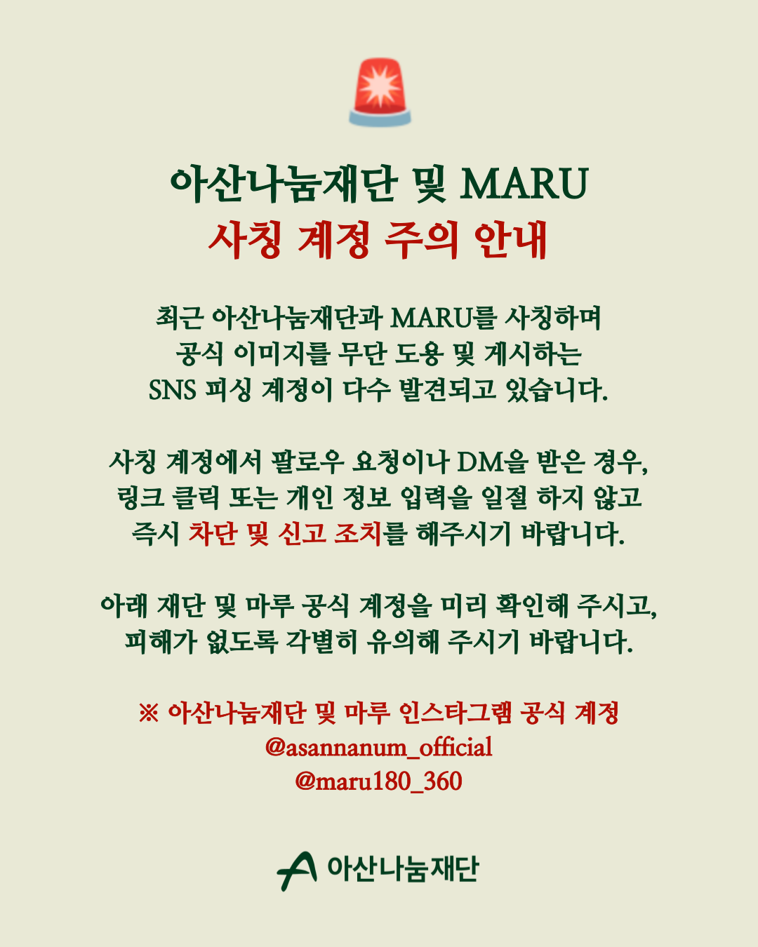 아산나눔재단 및 MARU 사칭 계정 주의 안내