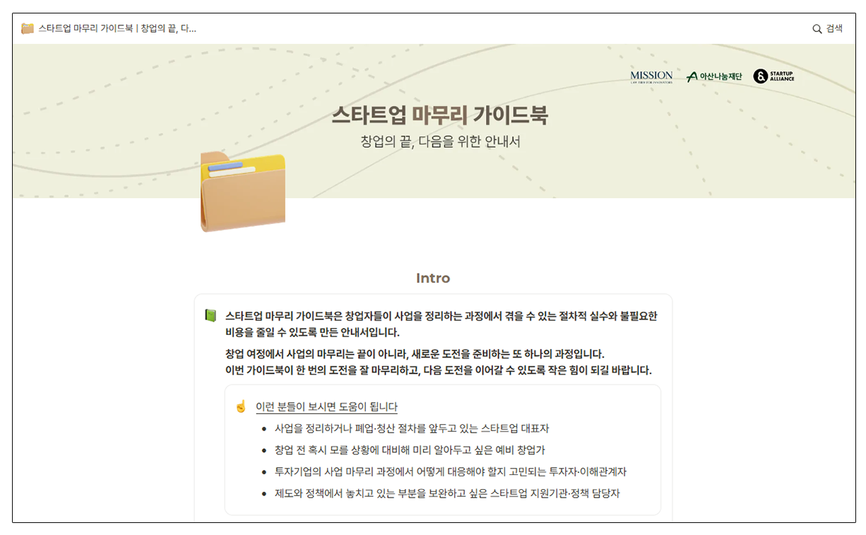 스타트업 마무리 가이드북은 창업자들이 사업을 정리하는 과정에서 겪을 수 있는 절차적 실수와 불필요한 비용을 줄일수 있도록 만든 안내서입니다. 이 안내서가 지금의 도전을 잘 마무리하고, 다음 도약을 준비하는 길잡이가 되길 바랍니다.