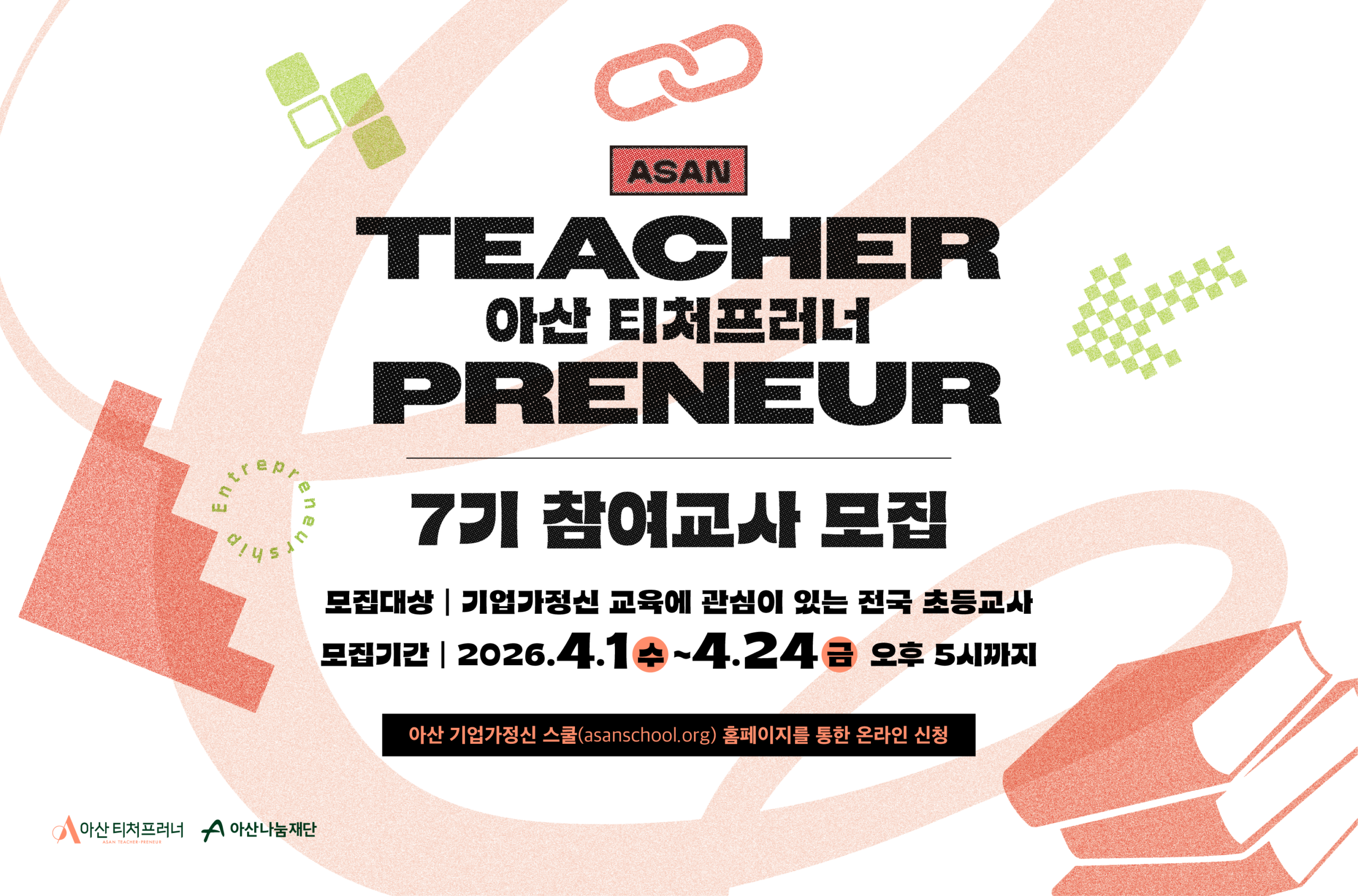 정남이 아산나눔재단 상임이사는 “아산 티처프러너는 교사가 기업가정신을 하나의 수업 주제로만 이해하는 데 그치지 않고, 학생들의 도전 정신과 문제 해결 역량을 키우는 수업을 직접 설계해볼 수 있도록 돕는 프로그램”이라며, “미래 세대의 기업가정신 역량 함양이라는 교육 미션에 공감하며 학교 안팎으로 기업가정신 교육을 실천해보고 싶은 초등 교사분들의 많은 지원을 바란다”고 전했다. (끝)